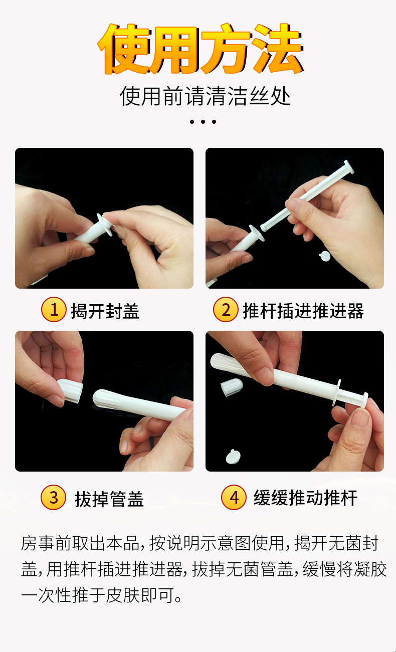 使用方法:房事前取出本品,按说明示意图使用,揭开无菌封盖,用推杆插进推进器,拔掉无菌管盖,缓慢将凝胶一次性推于外阴皮肤即可。