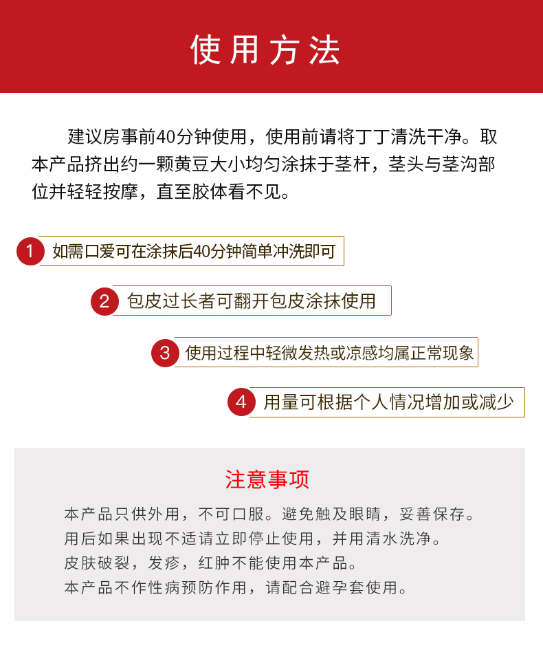 使用方法:性爱前40分钟,取本膏涂于茎杆、茎头与茎沟部位。轻轻按摩,直至膏体看不见。