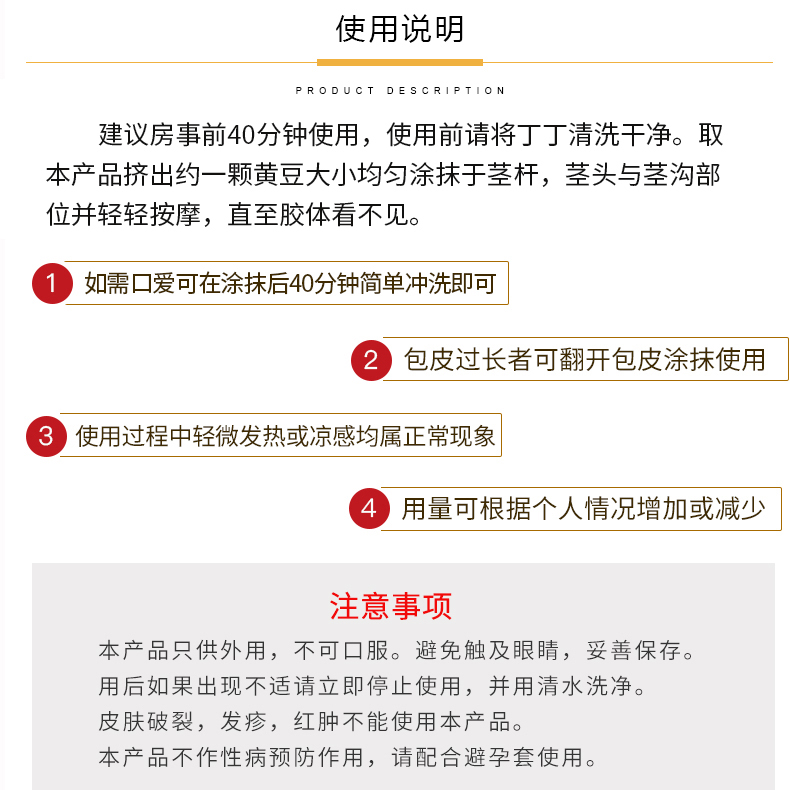 使用方法:性爱前40分钟,取本膏涂于茎杆、茎头与茎沟部位。轻轻按摩,直至膏体看不见。