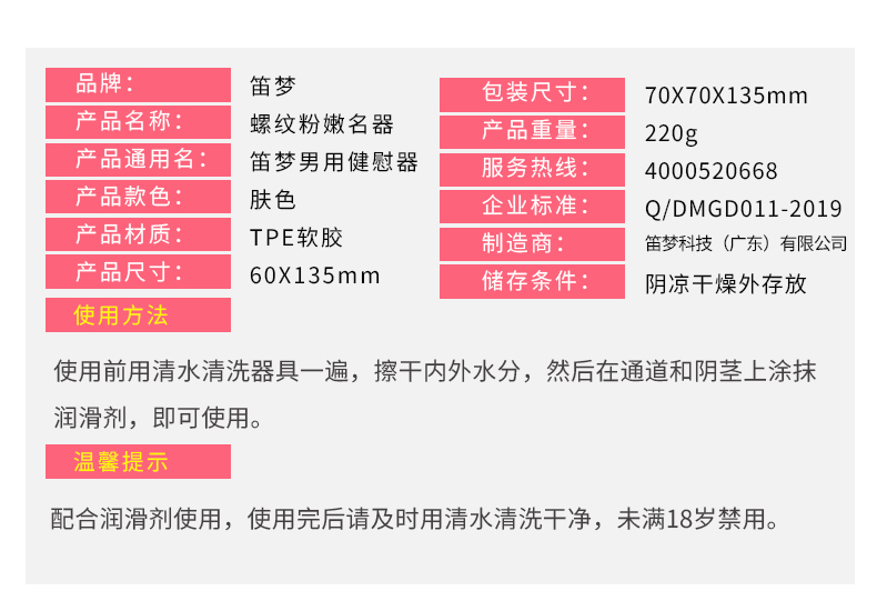 使用方法:使用前用清水清洗器具一遍,擦干内外水分,然后在通道和阴茎上涂抹润滑剂,即可使用。
