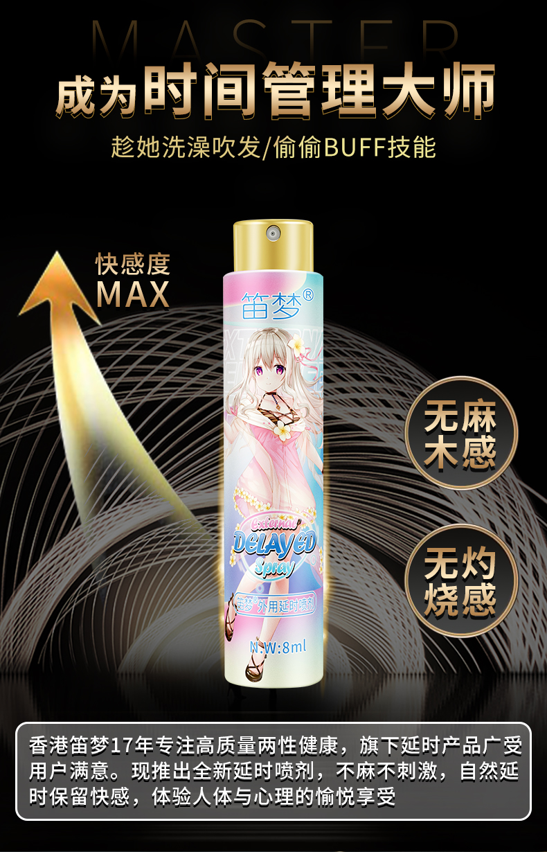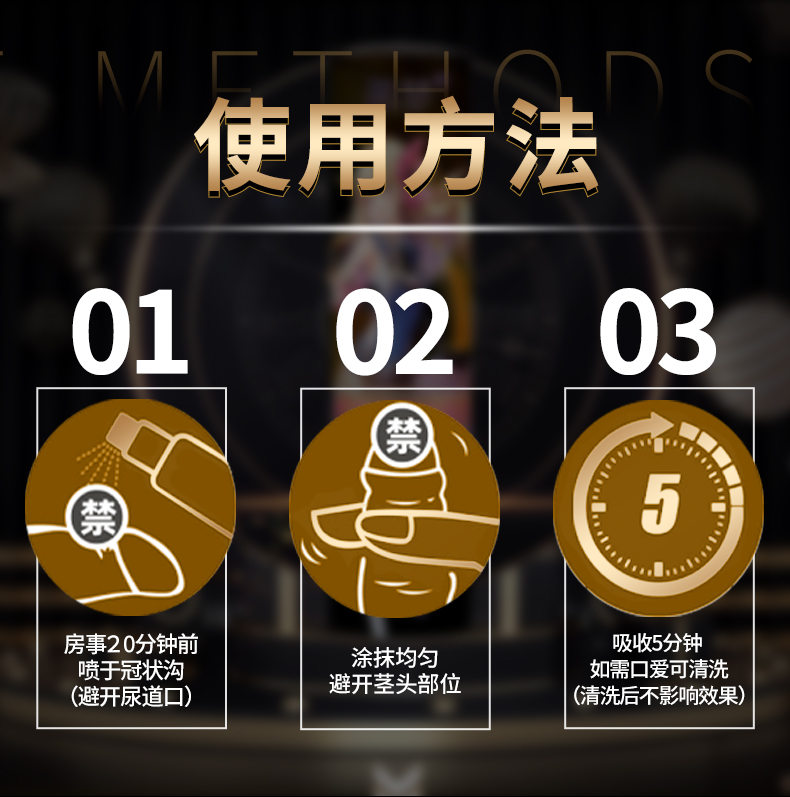 使用方法:房事前20分钟均匀喷于茎杆、茎头与茎沟部位即可。喷后有效时间为第20-150分钟。